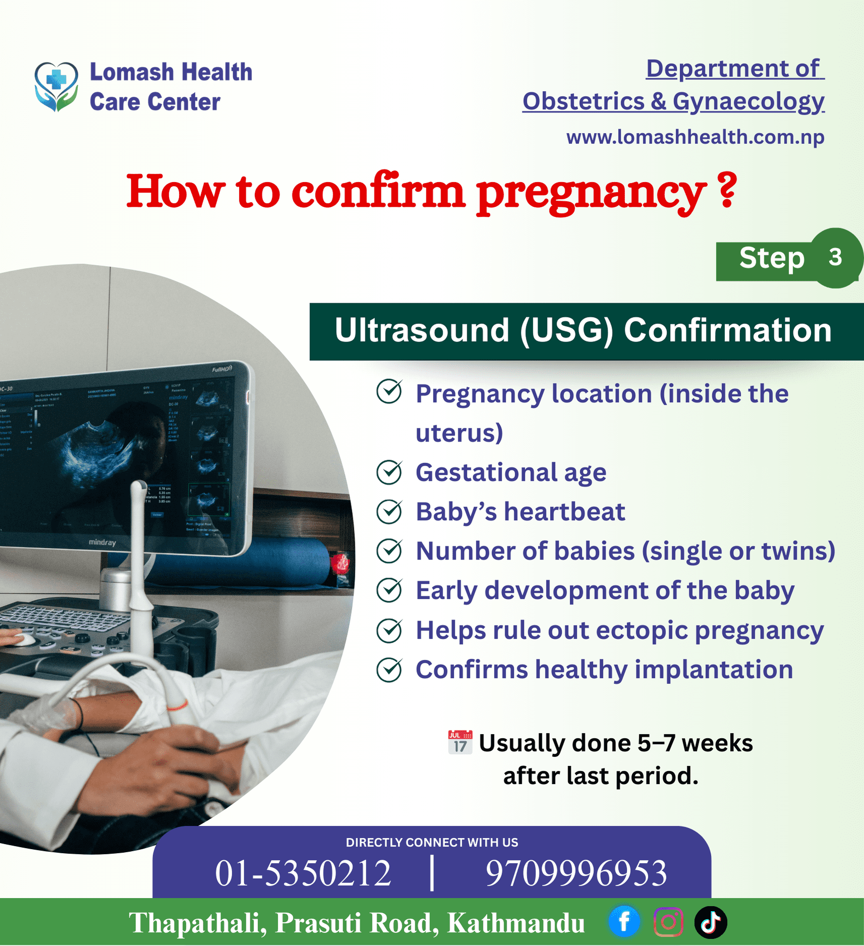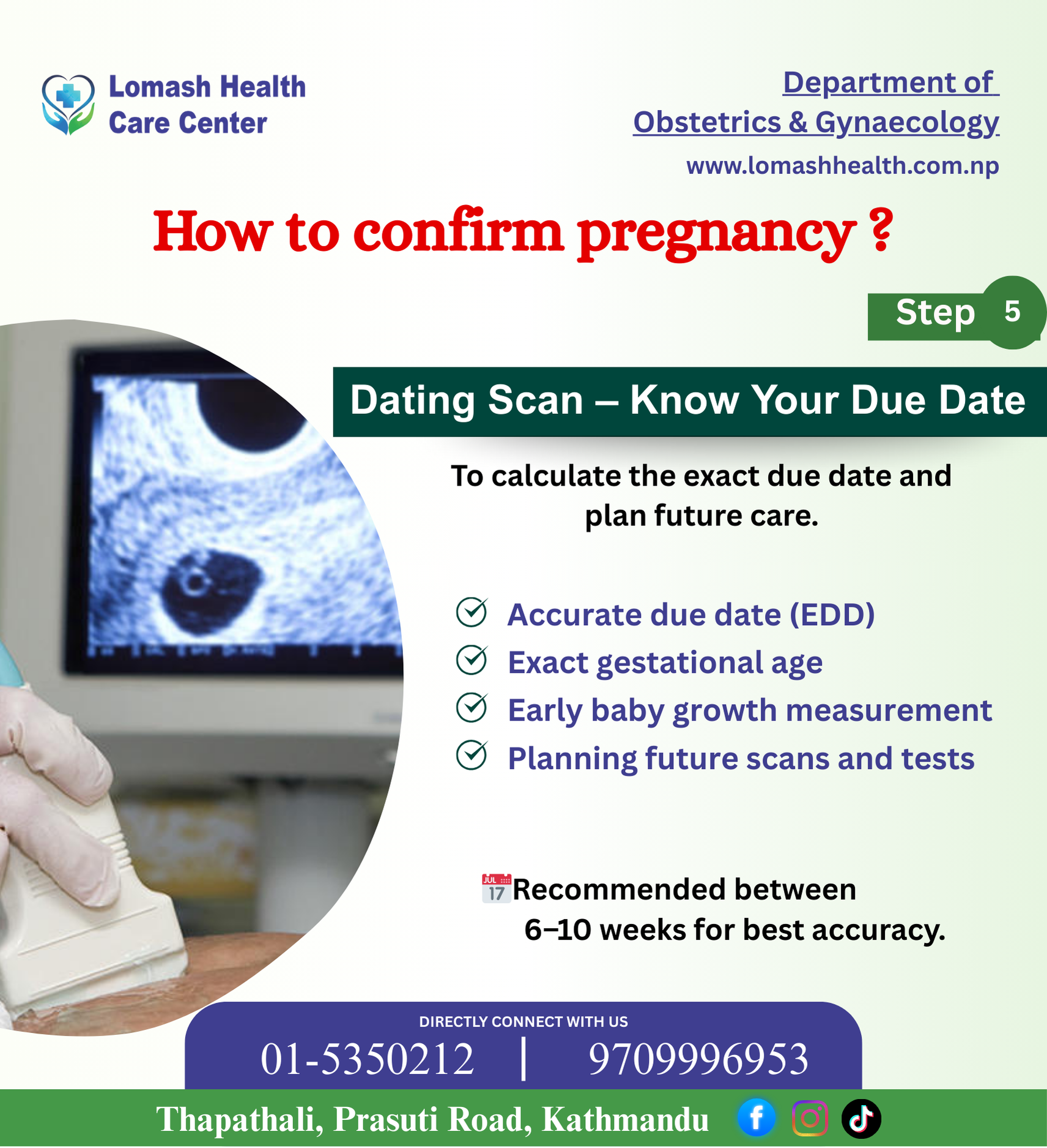 Pregnancy Confirmation Scan is the first ultrasound performed to confirm pregnancy and detect the baby’s heartbeat. It helps determine gestational age, location of pregnancy (intrauterine), and rule out conditions like ectopic pregnancy. If you suspect pregnancy, a pregnancy ultrasound in Kathmandu ensures early confirmation and peace of mind.